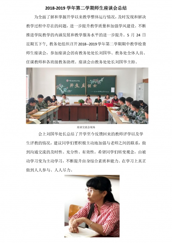 3月25日上午,教务处利用课间操时间,在教师休息室组织召开了任课教师座谈会,参加本次会议的有副院长谢飞,教务处处长刘国华和各位任课教师。会议由刘国华处长主持。会上刘处长对学院当前的教学情况做了简要分析,鼓励各位老师对学院的教学质量提升工作积极建言献策,希望老师们严格管理课堂纪律,并积极探索新的教学方式方法,激发学生学习兴趣、活跃课程气氛,改善课堂教学效果从而提高教学质量。谢院长向老师们介绍了当前...